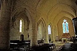 Alle konstruktiven Elemente, Wände, Gewölbe, Gurtbögen und Rippen sind steinsichtig aus hellem Natursteinmauerwerk. Alle Fensteröffnungen haben glatte, leicht schräge Leibungen und Spitzbögen, außer den beiden Rundbogenfenstern in der Südwand des romanischen Bauabschnitts.