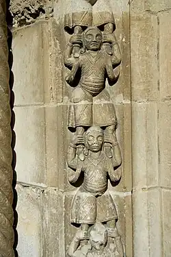 Die Kapitelle, auf die die Archivolten aufstützen, sind wieder aufwändig figürlich gestaltet, mit tierischer und menschlicher Plastik, in äußerst feinen Strukturen. Die Säulen der Gewände sind einfach glatt oder spiralförmig gewunden. Auf jeder Seite gibt es einmal eine „Säule aus Menschenleibern“. Es türmen sich jeweils sechs Akrobaten in knielangen Hosen übereinander auf den Schultern des unteren stehend. Man meint die Anspannung in ihren Gesichtern zu erkennen.