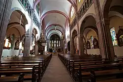 Nur der 36 Meter hohe Glockenturm von 1130 mit typischem Elsässer Satteldach, kräftigen Gesimsen, Rundbogen- und Diamantfriesen und Blendarkaden ist von dem originalen romanischen Gebäude noch vorhanden, das im 12. Jahrhundert wurde. Ursprünglich war er der Vierungsturm der im 12. Jahrhundert erbauten Kirche. Seine oberen vier Etagen sind besonders gut aufeinander abgestimmt: Dort vermehren sich von Etage zu Etage die Fensternischen in sich steigerndem Rhythmus – blinde Mauerbögen wechseln zu paarigen, schließlich zu dreiteiligen offenen Fensterbögen. Die Konstruktion dieses Turms – auch sein typisch elsässisches Satteldach – erinnert an ähnliche Turmbauten in Meyenheim, Murbach, Soultzmatt u. a.
