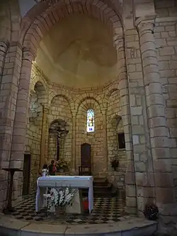 Der romanische Saalbau verfügt über ein Querhaus. Der Bereich hinter dem ursprünglich freistehenden Glockengiebel wurde im 14. Jahrhundert zu Schutzzwecken aufgestockt. Die Kirche hat ein romanisches und ein gotisches Portal. Die Vierungskuppel ruht auf Pendentifs, die Apsis besitzt eine Blendbogengliederung.