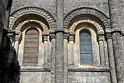 Die zweistufigen Archivoltenfenster des Chorhauptes und deren Blind-Varianten haben Archivoltenbögen mit tiefgründiger, geometrischer und pflanzlicher Skulptur auf den Stirn- und Innenseiten. Jeder einzelne Bogenstein trägt ein eigenständiges Ornament, in radialer Anordnung. Die Kapitelle der Archivoltenfenster sind pflanzlich und teilweise figural (Menschen und Monster) skulptiert. Das Kämpferband um das ganze Chorhaupt herum trägt auf seiner vorderen Sichtseite geometrische Ornamentik.