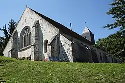 Über der Westfassade erhebt sich als Glockenturm ein mit Schiefer verkleideter quadratischer Dachreiter, der von einem Pyramidendach gedeckt wird. Die Außenmauern werden von Rundbogenfenstern durchbrochen und von weit vorstehenden Strebepfeilern gegliedert, die noch aus dem 12. Jahrhundert stammen.