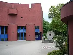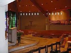 Der grosse Kirchenraum dient als Gottesdienstsaal für die Gemeinde, die angebaute Kapelle lädt zum stillen Gebet ein. Der fünfeckige Kirchenraum gruppiert die Bänke um den Altarraum und setzt damit den Gedanken einer Mahlgemeinschaft von Volk und Priester um.[4]