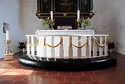 Die in Weiß gehaltenen Altarschranken mit goldfarben abgesetzten Girlanden sind klassizistisch vom Anfang des 19. Jahrhunderts.