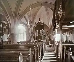 Die heutige Innenausstattung der Kirche mit Kirchengestühl, Emporen, Kanzelaltar und Orgelprospekt erfolgte 1852 im neugotischen Stil unter der Leitung des hannoverschen Landesbaumeisters Anton Eduard Bruno Wellenkamp (* 27. Februar 1812 in Kassel; † 25. Oktober 1875 in Göttingen).[6] Die geschnitzten Kanzelfiguren stammen von dem hannoverschen Bildhauer Georg Ludwig Hurtzig (* 27. März 1812 in Hannover; † 14. Oktober 1865 in Hannover).[7] Die Orgel wurde 1852 von dem Orgelbaumeister Philipp Furtwängler in Elze erbaut.[8] Die Emporen im Chor der Kirche sind bei der Kirchenrenovierung 1958 entfernt worden, um Raum zu schaffen für das Adenser Kruzifix, das seitdem an der südlichen Chorwand angebracht ist.
