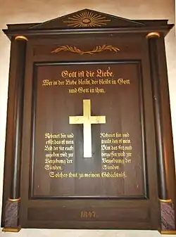 Die in ihrem Kern steinerne und mit Holz umkleidete Mensa des Altars hat eine Höhe von 1,10 Meter und misst in der Breite und Tiefe 1,75 beziehungsweise 0,85 Meter.[6] Ein früheres Retabel von 1847 hängt an der Nordwand der Kirche und zeigt ein Zitat aus dem 1. Johannes-Brief (1 Joh 4,16b ) und rechts und links eines schlichten Kreuzes die Einsetzungsworte des Abendmahls (1 Kor 11,23-26 ). Der heutige Jugendstil-Aufsatz ist ein Werk des aus Dänemark stammenden und später im Großherzogtum Oldenburg tätigen Künstlers Wilhelm Larsen (1861–1913). Er zeigt im Zentrum den gekreuzigten Jesus sowie rechts und links jeweils zwei der vier neutestamentlichen Evangelisten. Die zwei Inschriften stammen aus dem Alten (Ps 23,1 ) und dem Neuen Testament (Offb 2,10 ).