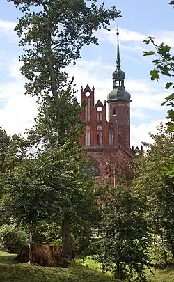 Die Bausubstanz der Kirche, die den Zweiten Weltkrieg recht gut überstanden hat, stammt zum Teil aus dem 13. Jahrhundert. Sie war ursprünglich Gotteshaus des 1278 gegründeten Dominikanerklosters.[1] In seiner heutigen Form wurde der Bau im 15. Jahrhundert errichtet. Im Zuge der Enteignung der Klöster während der Reformation nahm 1534 der Rentmeister Ambrosius Vormann Kloster und Kirche in Besitz und zerstörte die Ausstattung. Zu Anfang des 17. Jahrhunderts wurde die Kirche von Herzogin Erdmute, Gattin des Herzogs Johann Friedrich (1569–1600), im Inneren barockisiert und ein westlicher schlanker Kirchturm mit barocker, kupfergedeckter Haube errichtet. Die Einweihung der wiederhergestellten Kirche erfolgte am 24. Juni (Johannistag) 1602 durch den pommerschen Generalsuperintendenten Jakob Faber.
