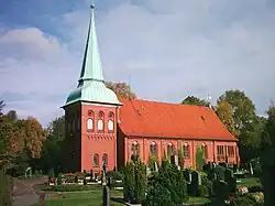 Eine weitere Umgestaltung nahm 1878 bis 1879 Johann Heinrich Martin Brekelbaum[6] vor. Dabei ersetzte er den bisherigen hölzernen Kirchturm durch einen Steinturm mit Kupferdach und ummantelte das morsche Fachwerk der Wände mit einer reichhaltig gegliederten neogotischen Fassade aus gelbem Klinker, die den Charakter der Kirche vollständig veränderte. Diese Fassade stellte sich bald als witterungsanfällig heraus und wurde auch unter Einfluss der Heimatschutzbewegung als überladen empfunden. 1906 bis 1907 gestaltete man die Fassade wieder schlichter und wechselte zu den heute noch sichtbaren roten Ziegeln. Auch bei der Dachform kehrte man wieder zum ortstypischen Walmdach zurück und entfernte die kleinen quergerichteten Satteldächer über den Seitenfenstern.[5]
