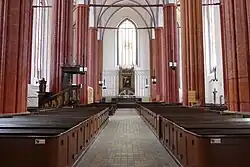 Die Kirche ist als dreischiffige Hallenkirche angelegt. Das Langhaus zieht sich über fünf Joche, der chorlose Abschluss ist dabei drei Joche breit. Die Kirche besitzt zwei Turmseitenhallen, die jeweils zwei Joche lang sind. Eine siebenjochige Vorhalle, ein Anbau aus dem 15. Jahrhundert, breitet sich über die Westseite aus. In dieser Vorhalle befindet sich auch das Westportal, jetziger Haupteingang zur Kirche. Der gesamte Kirchenbau ist aus Backstein errichtet.