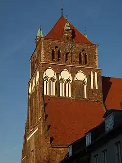 Der bereits in der ursprünglichen Konzeption der Kirche im 13. Jahrhundert angelegte Turm mit quadratischem Grundriss wurde in der zweiten Hälfte des 14. Jahrhunderts mit einem Pyramidendach versehen.[9] Das Dach ist zu jeder Seite mit einem kleinen Erker bestückt, der jeweils ein kleines Kupferdach trägt. Am Westgiebel der Marienkirche, das Mittelgeschoss des Turms flankierend, befinden sich ebenfalls kleinere Fialen und noch einige Verzierungen (Stargarder Blende). Davon abgesehen fällt der Turm insgesamt aber vergleichsweise schlicht aus.