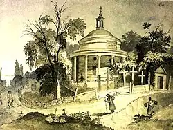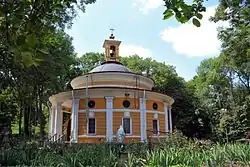 Der Architekt der von 1809 bis zum 1. September 1810 im klassizistischen Stil erbauten und 8000 Rubel teuren Pavillonkirche war der Russe Andrei I. Melenski, der auch die Christi-Geburt-Kirche in Kiew errichtete. Der Legende nach soll der Kirchenbau der Erzeparchie Kiew, in Nachfolge einiger Vorgängerkirchen, auf dem Grab des Waräger-Fürsten Askold stehen.[1]