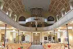 Carl Ludwig Wimmel hat mit der Gestaltung des Innenraums eine besondere eigene Leistung vorgelegt. Der helle Emporensaal mit seinen klaren Proportionen ist auf den zentralen Kanzelaltar und die reichhaltig gegliederte Ostwand ausgerichtet. Der Altarraum wird von zwei Nebenräumen flankiert und bildet eine rechteckige Nische, die von einem Halbkreisbogen nach oben abgeschlossen wird. Raumprägend sind die an der Westseite übereinander liegenden gegenläufig geschwungenen Emporen. Auffällig sind die schlanken Eisensäulen, die die Emporen tragen und für die sich der Architekt erst in späten Entwürfen endgültig entscheiden konnte.