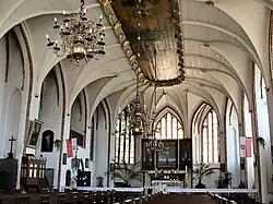Erst 1792 konnte der Wiederaufbau des Innenraumes beendet werden – unter Verzicht auf die dreischiffige Gliederung. Den Innenraum bedeckte der Zimmermann Johannes Kämmerling mit einem Holzgewölbe, das ein Jahr später von dem Maler Philip Ernst Eichner mit Polychromien verziert wurde. Am 25. März 1708 fand die Einweihung einer Orgel statt.