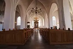 Die Kirche wurde mehrere Male erweitert. Christian IV. ließ im 17. Jahrhundert das Süd- und Nordschiff mehrjochig an die bis dahin einschiffige Kirche anschließen, wodurch der Kirchraum in Bezug auf seine auf den Chor im Osten ausgerichtete Hauptachse breiter als lang wurde. Der Baumeister Hans van Steenwinckel errichtete 1681 eine neue Grabkapelle. Ende des 17. Jahrhunderts ließ Christian V. ein weiteres Nordschiff errichten, welches heute seinen Namen trägt (Christian V.-Saal). Der Dachfirst dieser Hallenkirche steht quer zu ihrer liturgischen Hauptachse.