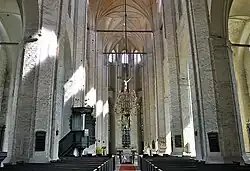 Im Zentrum des Heiligtums steht ein gemauerter Altar, darüber ein Kruzifix wohl aus dem 16. Jahrhundert, das die Kirchengemeinde im Jahr 1959 als Geschenk von der Kirchengemeinde St. Marien aus Stralsund erhielt. Die Assistenzfiguren befinden sich im Stralsund Museum. Das Kruzifix wird von zwei Leuchtern aus dem Jahr 1749 begleitet, die vier aus Seenot gerettete Seeleute der Kirche stifteten.[5] Er ersetzt einen barocken Hochaltar aus dem Jahr 1739, der beim Brand vom 9. April 1920 zerstört wurde. Dahinter gibt es ein Altarfenster mit dem Titel Der sinkende Petrus aus dem Jahr 1929. Südwestlich vor dem Altar steht ein Taufengel aus Zink, der 1848 als Abguss hergestellt wurde. Das Original schuf der dänische Bildhauer Bertel Thorvaldsen zuvor für den Dom zu Kopenhagen. Im südöstlichen Teil der Kirche steht mit der Figur von Jesus Christus eine weitere Kopie eines Werkes von Thorvaldsen. Die Kommerzienrätin W. Homeyer hat sie gestiftet. Die Kopie entstand 1889 im Atelier der Gebrüder Michaeli in Berlin und steht auf einem Sockel, der in der Steinschleiferei Kessel & Röhl in Wolgast hergestellt wurde. Gegenüber hängt ein von Max Uecker geschnitztes Kruzifix. Nordwestlich vor der Gruft steht an einem Strebepfeiler die hölzerne Kanzel von 1710 auf einem kannelierten Fuß. Der in dunklem Holz gehaltene Kanzelkorb ist mit Brüstungsfeldern geschmückt, die von gedrehten Säulen gehalten werden; das Lesepult mit reichem Schnitzwerk wurde 1645 gefertigt. Ein mit Akanthus verzierter siebeneckiger Schalldeckel schließt den Korb ab.