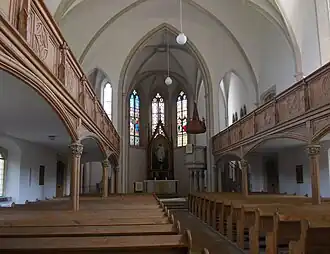 Im Inneren der Kirche findet sich ein kreuzrippengewölbter Emporensaal. Den Übergang zum Chor bildet ein mit drei Öffnungen versehener Triumphbogen. Seine Bauweise täuscht eine Dreischiffigkeit des Bauwerks vor. Die bauzeitliche Ausstattung der Kirche wurde überwiegend aus Lindenholz gefertigt. Dazu zählt unter anderem eine Hufeisenempore, welche in die beiden seitlichen Spitzbogenöffnungen des Triumphbogens mündet. Im Westen wurde die Empore polygonal ausgeführt. Dort dient sie als Standort der Orgel. Rechterhand des Mittelteils des Triumphbogens ist eine Kanzel aus Sandstein mit hölzernem Schalldeckel zu finden. Ebenfalls aus Sandstein besteht das Taufbecken. Das im Chor befindliche Altarbild, welches den auferstandenen Christus zeigt, wurde mit einem spitzbogigen Holzrahmen umfasst.[4][1]