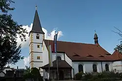 Der ehemalige gotische Chorturm, der 1644 aufgestockt und mit einem schiefergedeckten, spitzen Helm bedeckt wurde, blieb als Kirchturm im Westen vor dem nördlichen Seitenschiff des 1913 nach einem Entwurf von Fritz Fuchsenberger gebauten neobarocken Langhauses der Hallenkirche erhalten. Aus dem Dach des eingezogenen, dreiseitig abgeschlossenen Chors im Osten erhebt sich ein Dachreiter. Zur Kirchenausstattung gehören ein frühbarocker Hochaltar, der aus dem Kloster Michelsberg stammt, und die 1636 gebaute Kanzel, die aus der abgebrochenen Bamberger Franziskanerkirche stammt. Die Kreuzwegstationen malte 1777 Georg Karl Urlaub.
