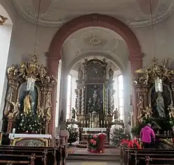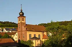 Der viergeschossige Kirchturm mit Zwiebelhaube springt aus der geschwungenen Nordfassade des Langhauses hervor. Das Langhaus besitzt drei Fensterachsen und eine Stuckdecke. Der südliche Chor beginnt mit einem Kreuzgewölbejoch und ist dreiseitig geschlossen.