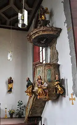 Die Kanzel befindet sich an der Südseite (Epistelseite) der Kirche. Auf dem Schalldeckel steht der Gerichtsengel, und an der Unterseite hängt die Taube, Symbol des Heiligen Geistes. Der Kanzelkorb wird von verschiedenen Figuren geschmückt. Es sind drei der vier Evangelisten mit ihren aufgeschlagenen Evangelien, deren Anfangsworte gezeigt werden. Die Kanzel stammt aus der Übergangszeit vom Barock zum Rokoko (Anfang bis Mitte des 18. Jahrhunderts). Die farbliche Gestaltung der Kanzel stimmt nicht mit derjenigen der übrigen Kirche überein. Besonders Hochaltar und Orgelprospekt bedürfen diesbezüglich einer farblichen Neugestaltung. Indes fehlt der Pfarrei das Geld.