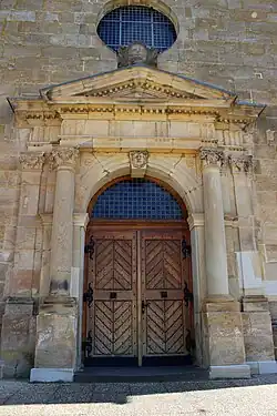 In der Westfassade befindet sich ein rundbogiges Portal, flankiert von zwei Säulen mit korinthischen Kapitellen, auf denen ein Gebälk mit Giebelaufsatz ruht. Bekrönt wird der Giebel über dem Portal mit dem Wappen des Priors von Tholey, das in das Wappen Tholeyer Abtei gesetzt ist. Die Inschrift mit Chronogramm im Gebälk lautet: „s. aLbano ereXIt ConVentVs thoLegIensIs“[3].