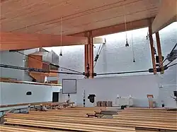 Der Kirchenraum selbst ist im Sinne des Zweiten Vatikanischen Konzils als ein breiter offener Raum konzipiert, dessen schräge Holzdecke zur breiten Altarwand hin stark ansteigt. Dicke Eichenholzbalken tragen die von Oberlichtern durchbrochene Decke und sind untereinander mit Stahlstangen abgespannt. Linkerhand befindet sich eine großzügige Orgel- und Musikempore. Das Pfarrzentrum schließt sich nordöstlich im rechten Winkel an das Kirchengebäude an.[2]