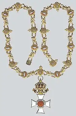 Für Militärverdienste konnte das Ordenszeichen ab diesem Zeitpunkt auch mit gekreuzten Schwertern zur Verleihung kommen, hierbei waren die Schwerter durch die Kreuzwinkel geführt, aber auch mit Schwertern am Ring (für Inhaber, die eine niedere Stufe mit Schwertern besaßen) hierbei wurden dazu zwei gekreuzte Schwerter zwischen Kreuz und Tragering angebracht.