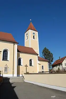 Das ehemalige Langhaus des gotischen Vorgängerbaus aus dem 14./15. Jahrhundert bildet den neuen Chor der heutigen Saalkirche. Die heutige Sakristei war der Chor des Vorgängerbaus und der heutige Kirchturm war ursprünglich ein quadratischer Chorflankenturm, dessen oberstes Geschoss den Glockenstuhl und die Turmuhr beherbergt, und der mit einem Pyramidendach bedeckt ist. An den neuen Chor wurde 1724 das neue barocke Langhaus nach Westen angebaut, das außen über dem Traufgesims mit einem Satteldach bedeckt ist und innen mit einem Stichkappengewölbe überspannt ist.