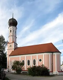 Die barocke Saalkirche wurde 1668 nach einem Entwurf von Hans Kogler errichtet. Sie besteht aus dem Langhaus, dem eingezogenen, halbrund geschlossenen Chor im Osten und dem Kirchturm mit Zwiebelhaube im Westen.