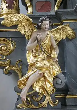 - Die Kanzel wurde 1785 angefertigt. Korpus und Schalldeckel sind mit Engelsputten besetzt und mit Rosetten und Girlanden verziert. Die Holzfigur auf dem Schalldeckel wird als Christus oder Johannes der Täufer gedeutet.