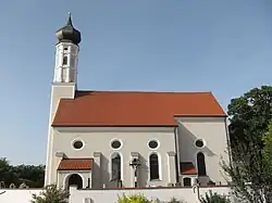 Die barocke Saalkirche wurde 1678 nach einem Entwurf von Hans Kogler auf den Grundmauern des mittelalterlichen Vorgängerbaus errichtet. Sie besteht aus dem von Strebepfeilern gestützten Langhaus, dem eingezogenen Chor mit der östlich angebauten Sakristei im Osten und dem mit einer Zwiebelhaube bedeckten Fassadenturm auf quadratischem Grundriss im Westen, dessen Obergeschosse mit Pilastern an den acht Ecken gegliedert sind.