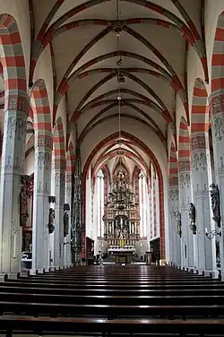 Der älteste Teil der Kirche ist der Turm in der Nordostecke, der von einem 1288 geweihten Bauwerk stammt. Er zeigt einen schlanken sechsgeschossigen Aufbau teils in romanischen, teils in frühgotischen Formen, das Kirchenbauwerk selbst entstammt der zweiten Hälfte des 14. Jahrhunderts. Der Turm ist mit einem Zinnenkranz und mit einem Spitzhelm des 17. Jahrhunderts abgeschlossen. Die Kirche besteht aus einem gestreckten Chor mit Fünfachtelschluss und einem siebenjochigen Hallenlanghaus mit deutlich überhöhtem Mittelschiff, also einer Stufenhalle. Das Gewölbe wird von Achteckpfeilern gestützt, die mit unverändertem Profil in die Scheidbögen übergehen. Die niedrigen Strebepfeiler haben zu der Vermutung geführt, dass einst eine Basilika geplant war und die Seitenschiffe erst nachträglich verändert wurden. Im Jahr 1736 wurde an der Südostecke eine Johann-Nepomuk-Kapelle angebaut, welche die ehemalige Sakristei einschließt; heute befindet sich die Sakristei im Turmerdgeschoss. Das Innere wird durch insgesamt vier Portale erschlossen, die jeweils auf der Nord- und Südseite im zweiten und im sechsten Joch angeordnet sind. Das östliche Portal auf der Nordseite hat ein maßwerkverziertes Tympanon. Die Kreuzrippengewölbe ruhen auf Konsolen. Die Fenster sind mit reichem geometrischem Maßwerk versehen, das bis zu vereinzelten Ansätzen von Fischblasenmaßwerk entwickelt ist. Eine Westempore in Stein zieht sich durch die drei Schiffe. Die letzte Instandsetzung erfolgte in den Jahren 1986–1991.