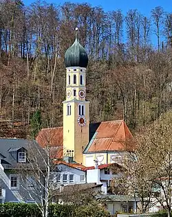 Die Kirche ist eine dreischiffige Hallenkirche zu vier Jochen mit eingezogenem, polygonal schließendem Chor und Südturm. An der südlichen Außenwand ist eine Kreuzigungsgruppe angebracht, die offenbar 1770/1780 durch Philipp Jakob Rämpl aus Wolfratshausen geschaffen wurde. Im Mittelschiff ist ein Tonnengewölbe mit Stichkappen auf Achteckpfeilern mit spitzbogigen Schildbögen eingezogen. Die quergestellten, miteinander verschliffenen Seitenschiffsgewölbe stoßen mit ihren Stichkappen bis zum Mittelschiffsgewölbe vor.