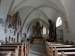 Die Kirche verfügt an der Außenwand über zwei steingerahmte Spitzbogentüren. Langhaus und Chor sind im Innenraum mit einem gotischen Kreuzgewölbe versehen. An der Seitenwand befinden sich ein in jüngerer Zeit freigelegter frühgotischer Freskenzyklus aus der Zeit des 15. Jahrhunderts mit der Darstellung des Heiligen Christophorus, Margarethe, Stephanus und Laurentius. Am Chorbogen steht die Jahreszahl 1592.
