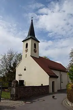 Die 1582 errichtete Saalkirche ist aus der Burgkapelle der zerstörten Burg Eismannsberg hervorgegangen. Sie wurde in der ersten Hälfte des 18. Jahrhunderts renoviert. Aus dem Satteldach, das das Kirchenschiff und den Chor bedeckt, erhebt sich über dem Chor ein Dachturm, der die Turmuhr und den Glockenstuhl beherbergt, und der mit einem achtseitigen, spitzen Helm bedeckt ist. Die Sakristei befindet sich unter dem Schleppdach im Süden des Chors.