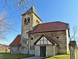 Es handelt sich um eine Saalkirche mit Chorturm. An der Südseite besitzt sie zwei rundbogige Fenster, an der Nordseite eine Vorhalle mit Fachwerkgiebel. Der Saal ist von einer schlichten Holztonne überwölbt. Die Emporen sind an der Nordseite zwei- und an der Westseite eingeschossig. Sie stammen aus dem 17. Jahrhundert. Ein Triumphbogen öffnet den Chorraum zum Saal. Der Chorraum ist kreuzgratgewölbt.