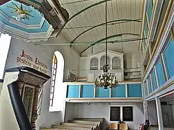 Das geschnitzte Altarretabel stammt aus dem 15. Jahrhundert und die hölzerne Kanzel aus dem 17. Jahrhundert.