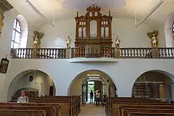 Im westlichen Teil des Kirchenschiffs befindet sich die von Säulen getragene Empore, die an der südöstlichen Ecke über eine 4,2 Meter hohe, hölzerne Wendeltreppe mit Steinmantel zugänglich ist. Zwischen den Säulen spannen sich drei Rundbögen.