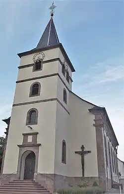 Das im klassizistischen Stil errichtete Kirchengebäude gliedert sich von Südwest nach Nordost in einen Turm mit Spitzhelm, ein fünfachsiges Langhaus, und einen fünfseitigen polygonalen Chor. Grundriss und Stil des Kirchenschiffs erinnern an Kirchenbauten von Peter Reheis in Illingen, Blieskastel und Reinheim.