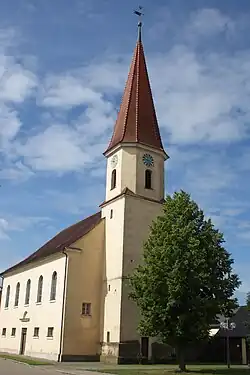 Das Langhaus der verputzten Saalkirche, das mit einem Satteldach bedeckt und im Süden abgewalmt ist, wurde 1821 an den im Kern mittelalterlichen Kirchturm angebaut. Der Kirchturm wurde 1696 mit einem achteckigen Geschoss aufgestockt, um die Turmuhr und den Glockenstuhl unterzubringen, und mit einem spitzen Helm bedeckt. Besonders sehenswert ist ein Gemälde des Abendmahls von Jacopo Amigoni aus dem 2. Viertel des 18. Jahrhunderts.