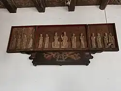 Auf dem Altar im Chor steht ein barockes Altarretabel, das Einwohner des Kirchspiels nach der Verwüstung der Kirche durch Tillys Truppen 1627 stifteten. Es wurde 1642 in der Werkstatt des Lundener Bildschnitzers Claus Heimen in Auftrag gegeben, der selbst aus dem Geschlecht der Russebellingmannen stammte und vermutlich ein Nachkomme eines der „Baumänner“ von 1571 war.[10] Im Zentrum befindet sich eine Kreuzigungsszene unter einem Bogen. Dabei sind die drei Gekreuzigten und die unter dem Kreuz stehenden Figuren von Maria und Johannes als Vollplastiken gearbeitet, während die Menschenmenge im Hintergrund als flaches Relief angedeutet ist. Mittig im Rahmen der Kreuzigungsdarstellung, direkt unter Jesu Kreuz, die heilige Anna auf einem mit ihrem Namen bezeichneten Podest. Diese für einen lutherische Kirche untypisch so zentral positionierte Heilige wurde dem Kreuzigungsbild erst nachträglich zugefügt, wofür die plastische Darstellung der Maria Magdalena unter dem Kreuz entfernt wurde.[11] Darunter ist das letzte Abendmahl Jesu mit seinen Jüngern als Relief dargestellt. Die lateinische Inschrift zitiert einerseits Lk 22,14–15 und nennt andererseits als Vorbild einen Kupferstich von Jan Sadeler nach einem verlorenen Gemälde von Peter Candid.[12] Über dem Hauptbild ist eine Ädikula, in der die Figur einer Frau mit Kind zu sehen ist, die entweder als Maria mit dem Jesuskind oder als die Verkörperung der christlichen Tugend der Caritas zu identifizieren ist.[13] Gekrönt ist das Retabel von einer Figur des triumphierenden Christus auf der Weltkugel. Weitere Figuren stellen Mose und Johannes den Täufer, die vier Evangelisten und zwei durch Frauengestalten verkörperte Tugenden, Hoffnung und Glaube aus 1 Kor 13,13 , dar. Die Figuren und Reliefs sind weiß gefasst, der Rahmen ist schwarz mit wenigen goldenen und farbigen Verzierungen.