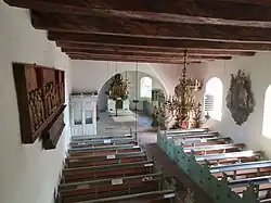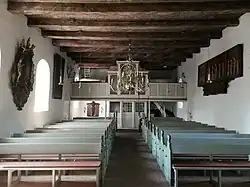 Im Innenraum sind Langhaus und Chor durch einen Chorbogen voneinander abgesetzt. Beide Bauteile jeweils mit einer bemalten Holzbalkendecke überspannt. Im Chor gibt es drei Rundfenster, im Kirchenschiff drei an der Südwand und zwei an der Nordwand.