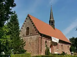 Die Kirche wurde 1571 als Pfarrkirche der nunmehr evangelischen Gemeinde neu aufgebaut, enthält aber, so Richard Haupt, noch viele Bauelemente der Kapelle von 1500. An den Neubau erinnert eine Inschrift über dem Südportal, die die Namen der verantwortlichen „Baumänner“ nennt und zwei Wappen zeigt, eins davon die drei Fische der Russebellingmannen, dass andere zeigt einen Bären mit Hellebarde, das Wappen der Woldriken.[3] Daneben ist eine ältere Platte in gotische Textura mit dem Datum 1507 eingemauert.[4]