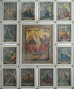 Das Kirchenschiff ist mit einer kunstvoll gestalteten Kassettendecke aus der Renaissancezeit (1608) ausgestattet. Sie wurde vom Amtsschösser Joachim Tempel gestiftet. Die reich ornamentierte Decke trägt im großen Mittelfeld das Bild des dreieinigen Gottes mit dem Heiligen Geist als Taube. Die zwölf Felder, die das Bild umgeben, wurden 1852 neu bemalt. An den vier Ecken sind die vier Evangelisten dargestellt. Die Felder zwischen den Evangelisten wurden mit acht Apostelbildern versehen, unter denen sich auch Paulus befindet.[20][21] Das Mittelfeld trägt die Umschrift: DEM DREY EINIGEN GOT ZV EHRN, / LAVTER VND REIN SEIN WORT ZV LERN / ON ALL ZVTHVN VND MENSCHEN TAND, / IST CANTZL, ZWEN MAN, VND WEIBERSTAND. / AVCH DIE DECK, VON IOACHIM TEMPEL / ERBAVT: ANDERN ZVM EXEMPEL / GOT DEM HERRN SEI GROS DANCK GESAGT, / DER GNAD DAZV VERLIHEN HAT.