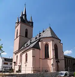 Das Bauwerk besteht aus einem breiten, dreijochigen Schiff mit einem eingezogenen Chor aus einem Joch mit Fünfachtelschluss und mit einem Westturm, der durch einen Spitzhelm mit eingesetzter Laterne und vier Ecktürmchen bekrönt wird. Die Fenster des Chores und des Schiffes sind mit Fischblasenmaßwerk versehen. Die Strebepfeiler des Schiffs sind nach innen gezogen. Das südliche Portal zeigt durchdringende Stäbe und das Gemeindewappen. Im Chor sind Sterngewölbe auf figürlichen Konsolen zu finden, ähnlich wie in Breithardt, Niederlibbach, Strinz-Trinitatis und Walsdorf. Die nach innen gezogenen Strebepfeiler sind zum Schiffsinnern hin säulenartig abgerundet und durch Schildbögen miteinander verbunden. Den Raumabschluss bilden Sterngewölbe mit doppelt gekehlten Rippen über Konsolen mit Wappenschilden. An der Südseite des Chores ist die netzgewölbte ehemalige Sakristei angebaut, in der seit der Restaurierung von 1954–1956 die Orgel eingebaut ist. Die beiden unteren Turmgeschosse schließen mit Kreuzgewölben.