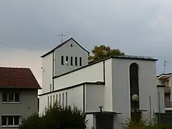 Die Saalkirche wurde 1931/32 nach Entwürfen von Hans Herkommer erbaut. Sie wurde am 14. Februar 1932 nach nur kurzer Bauzeit von einem halben Jahr geweiht. Nachdem die Nationalsozialisten an die Macht gekommen waren, wurde Kritik an dem Gebäude lauter, die schon während des Genehmigungsverfahrens Anfang der 1930er Jahre teilweise aufgekommen war. Das Gebäude sei undeutsch und Ausdruck von Bau-Bolschewismus. Auf politischen Druck wurde 1938 das Bauwerk teilweise „entschandelt“: der Turm mit einem ursprünglich gering geneigten Pultdach erhielt ein 2,4 Meter hohes Satteldach mit Firstrichtung wie beim Kirchenschiff. Die Änderung hatte Architekt Herkommer selbst betreut. Zu weiteren Änderungen kam es aber nicht.