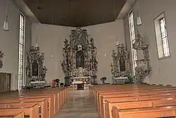 Der Hochaltar, die Seitenaltäre und die Kanzel sind aus dem Vorgängerbau übernommen. Sie entstanden im Jahr 1749 im Stil des Rokoko. In der südlichen Wand ist eine Inschrift des Würzburger Bischofs Julius Echter von Mespelbrunn mit der Jahreszahl 1613 angebracht. Die Orgel ist auf der westlichen Empore aufgestellt. Im Kirchturm hängen vier Glocken mit den Tönen g′ − a′ - c″ - d″.