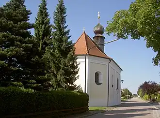 Die traufständige Saalkirche wurde 1692 erbaut und in der zweiten Hälfte des 18. Jahrhunderts umgebaut. Sie besteht aus einem im Osten dreiseitig geschlossenen Langhaus. Aus dessen Satteldach erhebt sich über dem Giebel im Westen ein achteckiger Dachreiter, der mit Schindeln verkleidet und mit einer Zwiebelhaube bedeckt ist. An das Langhaus wurde nach Süden eine zweigeschossige Sakristei angebaut.