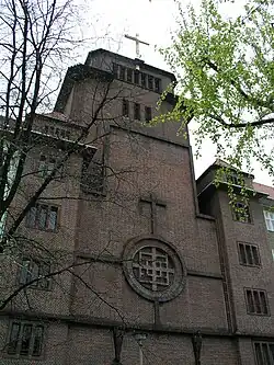 Die gesamte straßenseitige Fassade der Kirche ist mit rotbunten Klinkersteinen verblendet; das (nun) nur einseitig angeschlossene fünfgeschossige Pfarrhaus nimmt die Formen und die Klinker im Sockelbereich und im ersten Geschoss auf, darüber wurde es mit grauem Edelputz verkleidet und war so vermutlich preisgünstiger als ursprünglich gedacht.