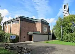 Das Gebäude, eine große Saalkirche von Backstein und Stahlbeton, wurde von 1963 bis 1965 nach Plänen von Herman Gehrig errichtet. Das Schiff ist durch Betonquerbinder in fünf Joche unterteilt, deren Seitenwände nach innen versetzt sind. Die Decken im Schiff und im eingezogenen Chor sind leicht gesattelt. Die Wände sind durch Betonglasbahnen und ein oberes Lichtband gegliedert, an der Giebelseite ist ein Kreisfenster zu sehen. Die Verglasungen mit ornamentalen Mustern wurden nach Entwürfen von Hermann Gehring gestaltet. Der Campanile steht daneben, er ist mit Blechen verkleidet.