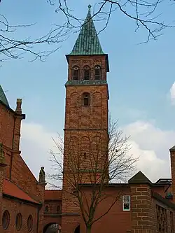 Auf der Südseite sind der rechteckige Altarraum sowie die Tabernakel- und die Marien-Kapelle angefügt. Die Portalfront im Norden besteht aus einer Eingangshalle mit repräsentativer Giebelfassade. Die drei Portalbögen setzen sich östlich in einem zweijochigen Bogengang fort, an den sich der Campanile anschließt.